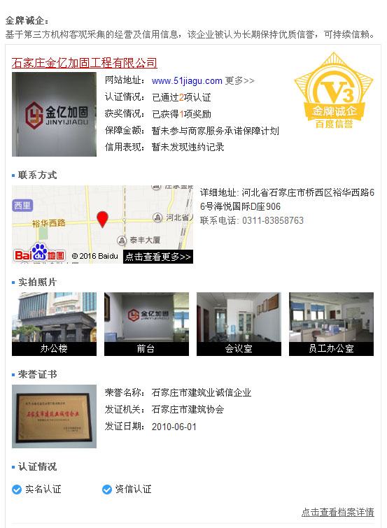2016年6月,百度權威認證機構委派專員來公司考察,針對經營場所、資本及財務能力、生產及研發能力、運營能力、產品及品牌能力、信息系統管理能力、質量管理能力、售后服務能力等十八項進行核驗。正式通過百度誠企認證企業,被百度推薦為百度誠企專區金牌商戶,授予V3信譽等級,獲得了百度的認可與強勢推薦企業。百度這標志著金億加固公司在誠信檔案中又多了濃墨重彩的一筆,在建筑加固行業中一枝獨秀,繼續保持強勁的發展勢頭。