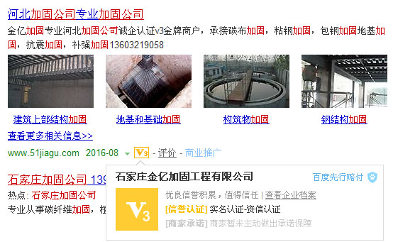 百度公司的誠企專區認證,不僅是對金億加固公司實力的認證,更有力保障了廣大網民客戶的利益。由于加固改造的市場需的發展,出現了大量的加固公司。但客戶在百度進行搜索關鍵詞進行查詢的時候,無法判斷哪個企業更有實力,哪個企業是真實的加固公司,哪個加固公司的信譽度更高。百度通過大數據對所有百度推廣客戶進行篩選,對長期合作的高端優質客戶提供的誠信體系產品中的頂級服務,是基于一系列客觀真實的商家資信認證、信用記錄、承諾保障和口碑評論等數據,為中小企業提供多方位誠信信息匯聚展現和背書服務,為優質企業提供權威形象展示。同時也保障了廣大網民客戶的利益,另外互聯網信息魚龍混雜,容易被無效鏈接誤導,很難判斷哪家是真正的企業網站,V3的標志可以更加直觀的引導客戶選擇金億加固公司。
