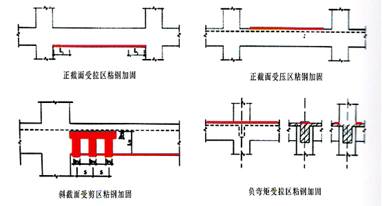 利用專用結構膠將處理后的鋼板粘貼在需要加固的混凝土構件表面,使鋼板與混凝土結構形成一個整體共同受力,粘鋼加固法不僅提高了被加固構件的強度,對構件的裂縫展開及撓度發展也有抑制。