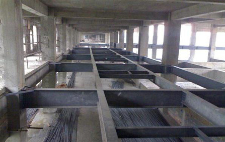 框架柱打眼植筋增設預埋鋼板,安裝型鋼焊接,鋪壓型鋼板,綁筋澆筑。